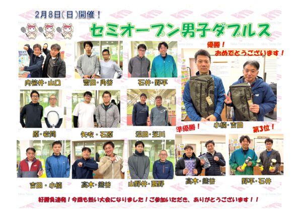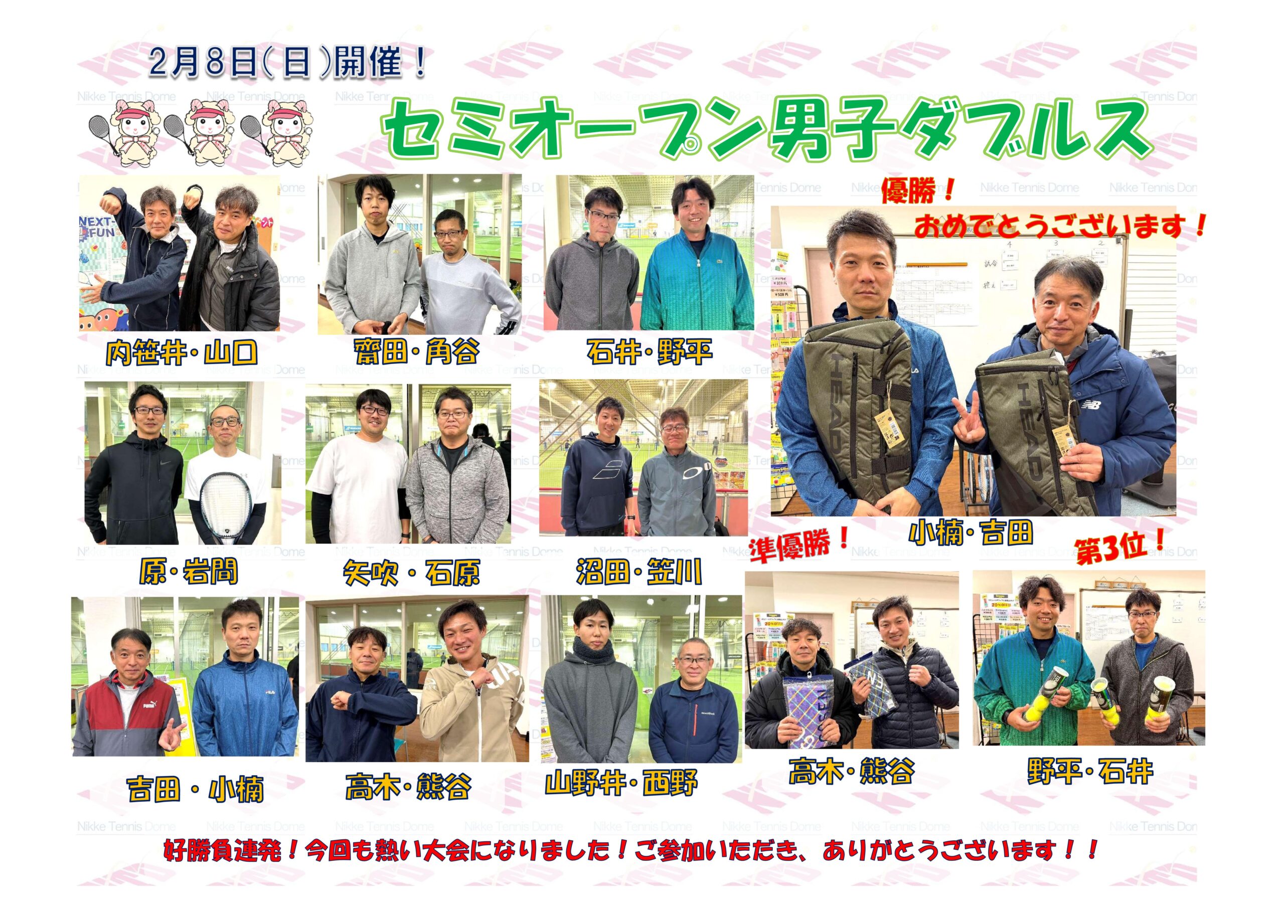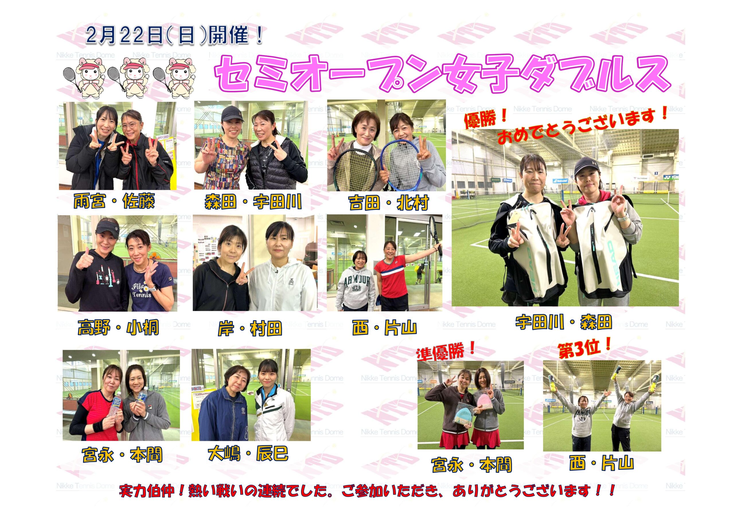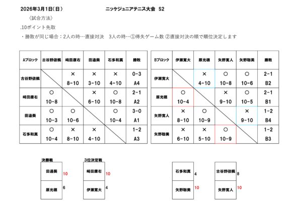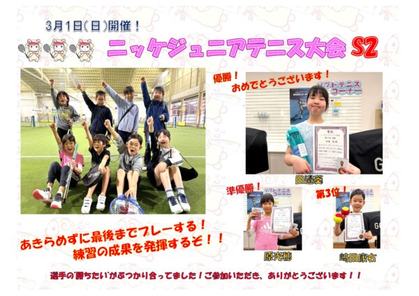 イベント&新着情報 3月8日(日)開催!! ニッケジュニア大会S4 2026年03月09日 3月8日(日)開催!! ニッケジュニア大会S3 2026年03月09日 3月1日(日)開催!! ニッケジュニア大会 S5 2026年03月02日 3月1日(日)開催!! ニッケジュニア大会 S2 2026年03月02日 2月22日(日)開催!! セミオープン女子ダブルス 2026年02月24日 2月8日(日)開催!セミオープン男子ダブルス 2026年02月09日 2月1日(日)開催!コーチも参戦!!ダブルスチーム対抗戦 2026年02月04日 1/25(日)開催‼ テニトレ倶楽部 2026年01月26日 1月18日(日)開催!! アベレージカップ 2026年01月23日 12月21日(日)開催! ニッケジュニア大会S5 2025年12月23日 1 / 1812345...10...»最後 »
