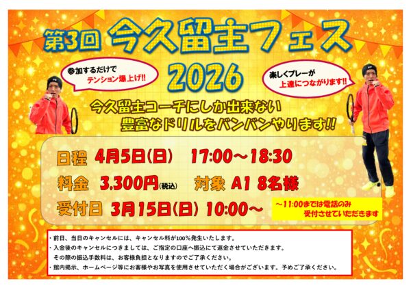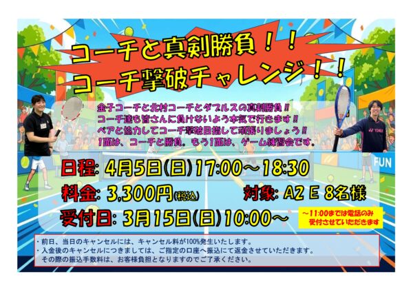 イベント&新着情報 4月12日(日)開催!! セミオープンミックスダブルス 2026年03月14日 3月8日(日)開催!! ニッケジュニア大会S4 2026年03月09日 3月8日(日)開催!! ニッケジュニア大会S3 2026年03月09日 4月5日(日)開催!! 第3回 今久留主フェス 2026 2026年03月07日 4月5日(日)開催!! コーチと真剣勝負!! コーチ撃破チャレンジ!! 2026年03月07日 3月1日(日)開催!! ニッケジュニア大会 S5 2026年03月02日 3月1日(日)開催!! ニッケジュニア大会 S2 2026年03月02日 4月のゲーム練習会 2026年03月02日 2月22日(日)開催!! セミオープン女子ダブルス 2026年02月24日 3月のテーマレッスン 2026年02月23日 1 / 2312345...1020...»最後 »