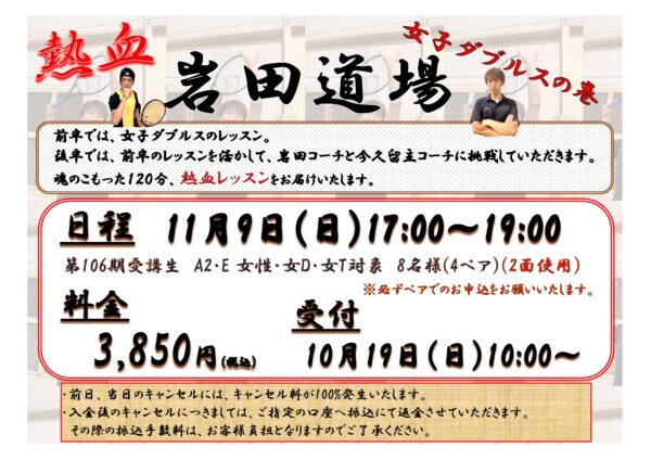 北村コーチのテーマレッスン ダブルスボレー 11月9日(日)