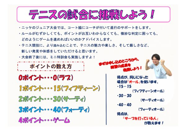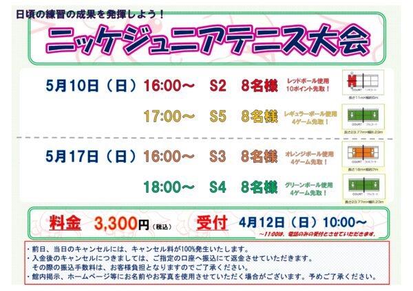 ニッケジュニアテニス大会 S2・S5:5月10日(日) S3・S4:5月17日(日)